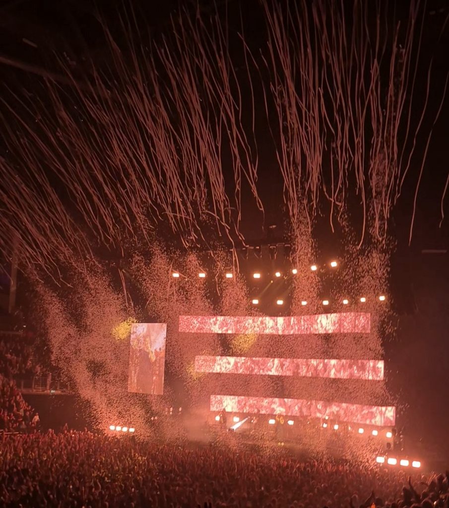 One of the evening’s standout moments arrived when the band welcomed GRAMMY Award Nominee Myles Smith onstage for a textured rendition of Flaws, prompting a wild reception from the crowd, who were eagerly loud in response. Following with Oblivion felt perfect; thousands of phone lights were lifted into the dark while a stirring violin line created a beautifully sombre moment of connection. With such a deep catalogue to draw from, the band’s ability to shape the night’s momentum is an art in itself; chaos and brilliance collided as WHAT YOU GONNA DO??? triggered the first confetti blast and sent the crowd into a frenzy.