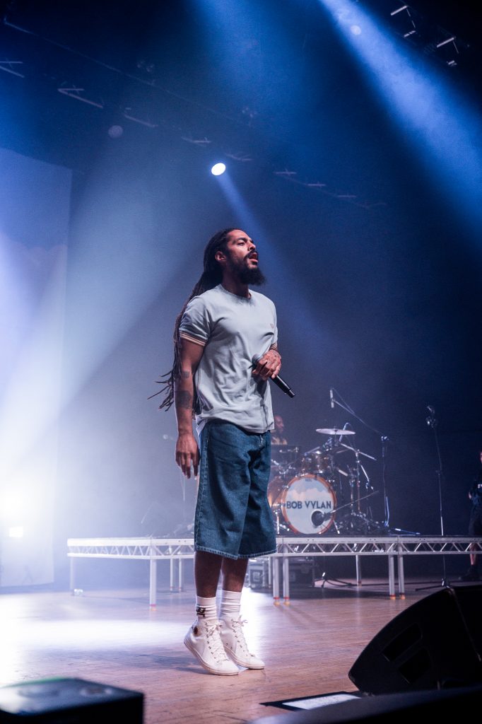 From the moment Bob Vylan’s frontman, Bob, stepped onto the stage, it was clear this was going to be an intense gig. The lights dimmed, the bass dropped, and a wave of anticipation swept across the crowd. The band kicked off with ‘Reign’ instantly setting the tone for the evening. Bob’s delivery was fierce, with each lyric laced with the frustration and defiance that has come to define their sound.