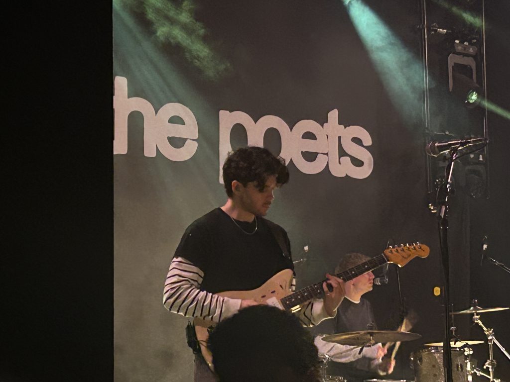It wasn’t long before we heard the familiar synths of And I’d Do It Again mixing with screams and cheers of excited fans, the flickering white lights of the Poets’ staging beckoning first drummer Marcus Yates and bassist Roo Burge onstage, followed closely by Tommy Longhurst and guitarist Clem Cherry.