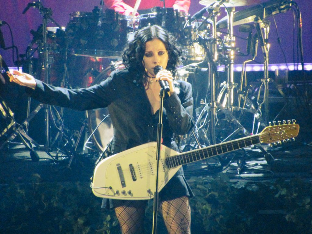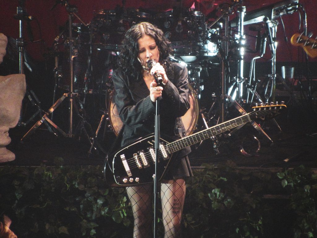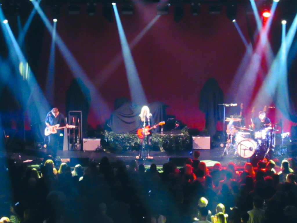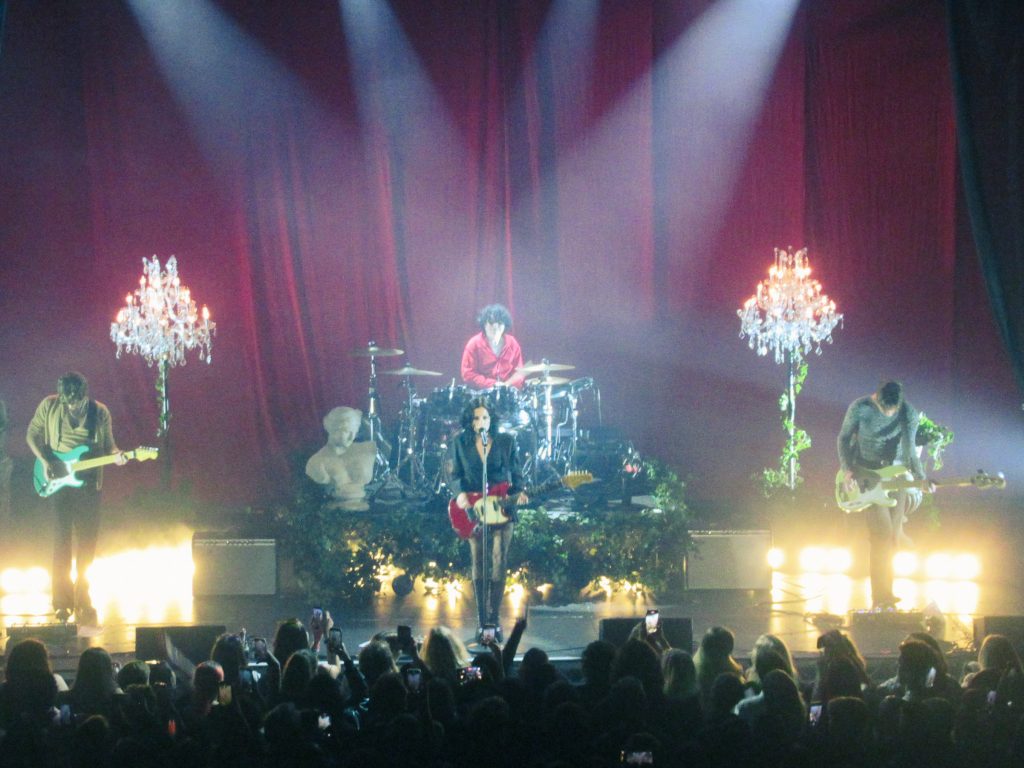 Through the sea of leather jackets, tour merch, and Doc Martens (reminiscent of a 2014 Tumblr aesthetic), a pair of chandeliers framed the stage, flanked by classical statues, ivy and red curtains giving the venue a theatrical vibe. The stage design mirrored the cover of the new record, carefully curated like much of their pop-punk material. This London crowd were already well-acquainted, so no introductions were needed asthey launched straight into Perfume, the lead single from Smitten.