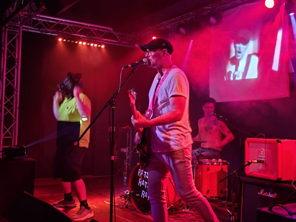 Rats! Rats! Rats! have made a name for themselves locally, having supported the likes of Snuff and ex Sex Pistols member Glen Matlock. They always manage to deliver a set that is lively and animated and tonight was no exception. UB40’s ‘Rat In My Kitchen’ played as they walked onto stage with a montage projected behind them, flicking between famous old school clips of films such as Pink Panther and Forrest Gump, as well as more personal touches with the Gosport ferry and drummer Rich’s very own pet dog Storm. Opening with 2024 single Rude, they immediately proved just how much noise 2 blokes on stage are capable of making. There seemed to be an overarching theme of death throughout tonight’s sets, with many songs across the board featuring it though in a more lighthearted way than one would first imagine, and ‘All Your Friends Are Dead’ from the bands first EP really drove that home. Despite the music being burly, an element of humour is brought throughout with songs like ‘Instant BO’ and ‘Support Your Local Dentist’, and vocalist Andy delivers them perfectly. They ended the set with ‘BMX’, a tune off their debut album Bloody Hello, which in true punk fashion is a song about being online and the higher uppers being able to see everything we browse against our will. Rats x3 brought a fun, high energy set to Southsea, one that I think we could all do with getting on board and letting loose with.